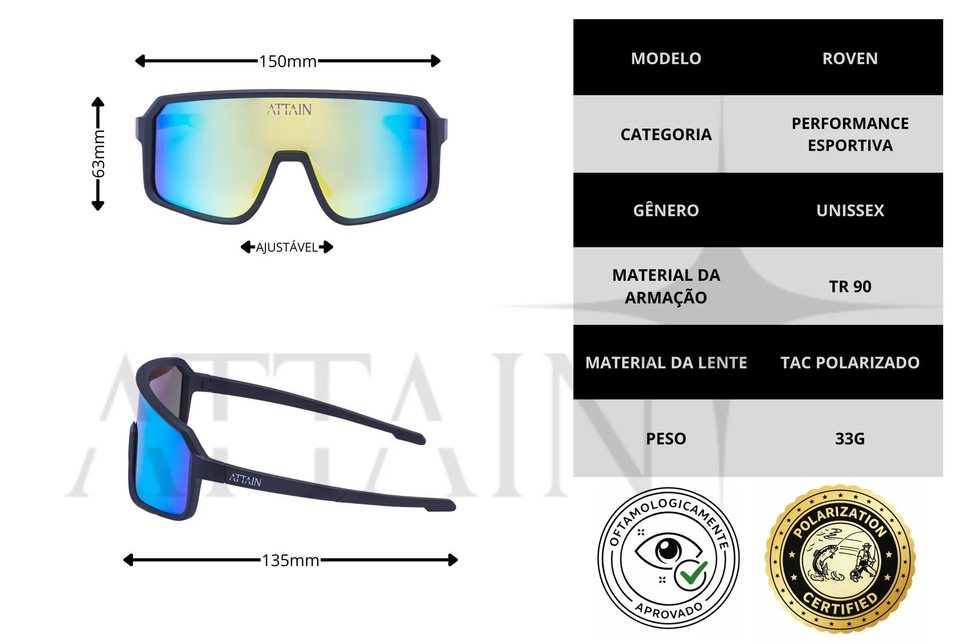A armação é construída em TR90, material de alta performance conhecido por permitir proporcionar leveza, flexibilidade e resistência a impactos, mesmo em Geometrias sofisticadas como é o caso do ATTAIN ROVEN, Essa tecnologia oferece maior durabilidade estrutural e estabilidade no rosto, proporcionando conforto e segurança mesmo em esforços contínuos.